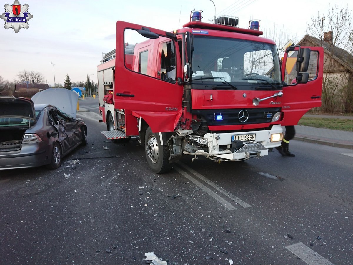 W tym samym czasie na ulicy Świderskiej w Łukowie doszło do kolejnego zdarzenia, które miało związek z wypadkiem w Sarnowie. Właśnie do tego wypadku jechał samochód straży pożarnej. Z jadącym na sygnałach świetlnych i dźwiękowych „wozem bojowym” zderzył się samochód marki Saab, którym kierował 18-latek z gminy Stanin. Na szczęście w tym zdarzeniu nikt nie doznał obrażeń. Uszkodzeniu uległy jedynie pojazdy biorące udział w kolizji. Pracujący na miejscu policjanci z łukowskiej drogówki ustalili, że kierujący osobówką nie ustąpił pierwszeństwa przejazdu pojazdowi uprzywilejowanemu i za to został ukarany mandatem.