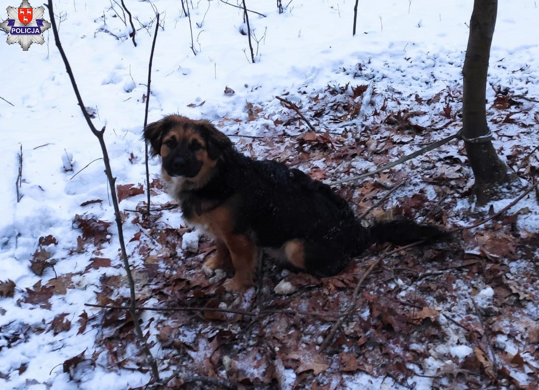 Psa przywiązanego smyczą do drzewa znalazła w lesie 19-letnia łukowianka. Młoda kobieta i jej mama zaprowadziły do wyziębionego psiaka dzielnicowych, a ci przekazali go później do schroniska. Policjanci poszukują osoby, która porzuciła w ten sposób swoje zwierzę.