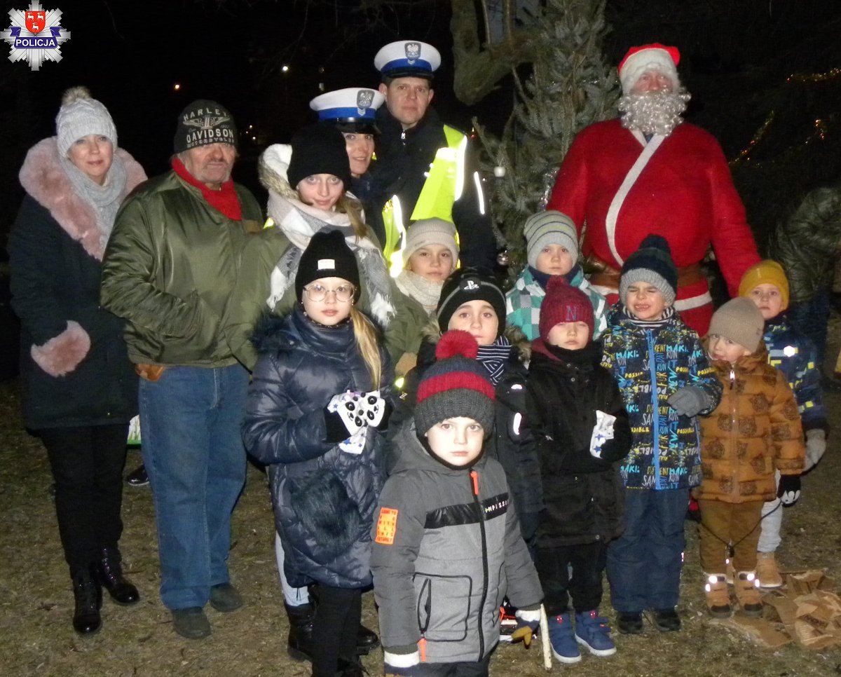 Razem z życzeniami wszystkie maluchy dostały od niego prezenty. Do życzeń przyłączyli się też mundurowi. Policjanci z dziećmi i Świętym Mikołajem udekorowali choinkę odblaskowymi breloczkami. Maluchy obiecały mundurowym, że później zabiorą odblaski z choinki i przystroją nimi swoje szkolne plecaki i ubrania. Dzięki nim będą bardziej widoczne na drodze.