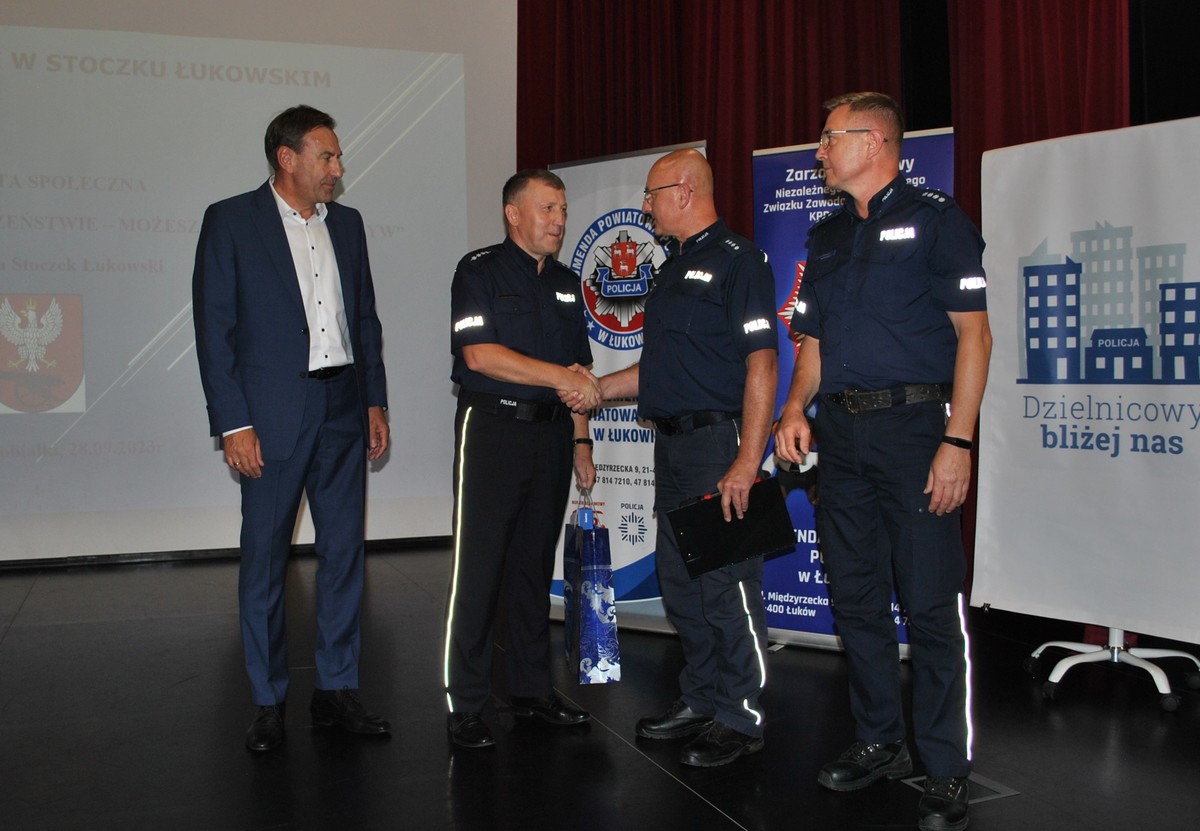 Przyjemnym akcentem spotkania była możliwość nagrodzenia asp. szt. Andrzeja Rosy, który od wielu lat pełni służbę w Komisariacie Policji w Stoczku Łukowskim. Kierownictwo łukowskiej komendy, a także przedstawiciele lokalnych władz samorządowych podziękowali policjantowi za jego ogromny profesjonalizm i zaangażowanie w codziennej służbie. Jego wiedza i umiejętności pozwoliły mu na zajęcie pierwszego miejsca w powiatowym konkursie na najlepszego oskarżyciela publicznego. Policjant zapewnił, że dołoży wszelkich starań, by jego wieloletnie doświadczenie umożliwiło mu godne reprezentowanie naszego powiatu na szczeblu wojewódzkim, a nawet ogólnokrajowym.