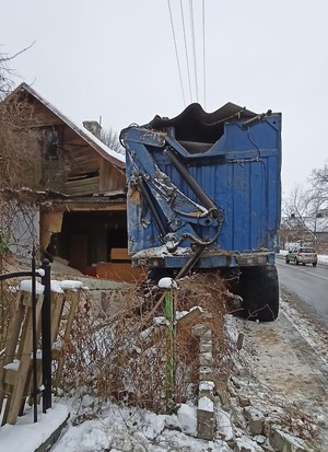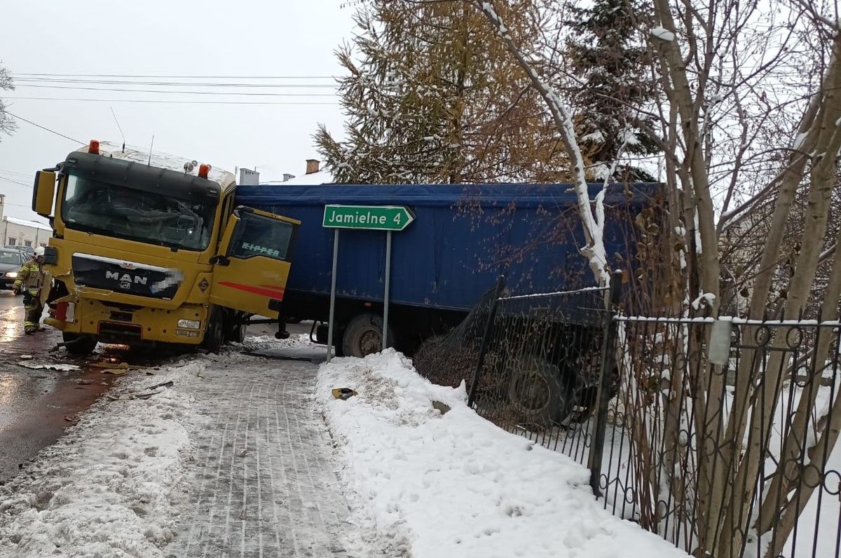 Mundurowi którzy przyjechali we wskazane miejsce ustalili, że kierujący pojazdem wolnobieżnym – specjalistyczną maszyną leśną – jechał po jezdni w kierunku centrum miasta. Droga w tym miejscu biegnie „pod górę” i pojazd wolnobieżny miał problemy by pokonać to wzniesienie. Na śliskiej nawierzchni jezdni zsunął się „w dół” i uderzył w jadący za nim samochód ciężarowy. Uderzona ciężarówka częściowo zsunęła się w boczną drogę, natomiast pojazd wolnobieżny uderzył w pobliski niezamieszkały drewniany budynek. Na szczęście kierujący ciężarówki i pojazdu wolnobieżnego nie doznali obrażeń ciała. Policjanci ustalili, że obaj mężczyźni byli trzeźwi.