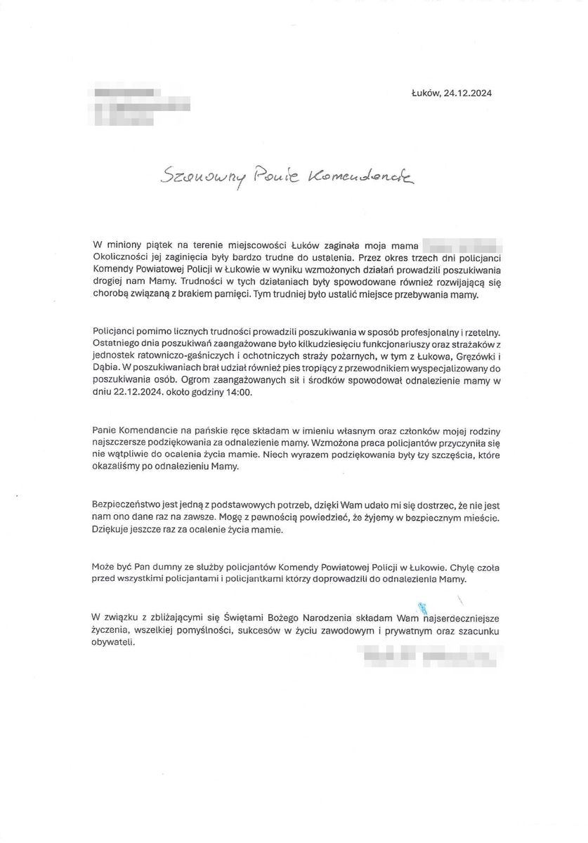 „... wyrazem podziękowania były łzy szczęścia, które okazaliśmy po odnalezieniu Mamy”. To kilka słów i fragment listu jaki skierował do łukowskiej komendy syn odnalezionej przez policjantów 73-latki.