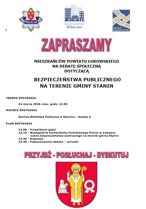 W tym celu serdecznie zapraszamy mieszkańców powiatu łukowskiego, na debatę społeczną poświęconą bezpieczeństwu publicznemu na terenie gminy Stanin, która odbędzie się 24 marca 2026 roku o godz. 12.00 w Gminnej Bibliotece Publicznej w Staninie – Kosuty 4.