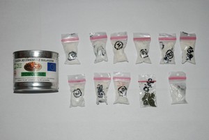 Postanowili otworzyć konserwę mającą zawierać kaszę z gulaszem. Gdy uchylili wieko puszki ich oczom ukazały się wycofane z obiegu monety polskie oraz dwie metalowe śruby okręcone papierem. Przedmioty te zapewniały „konserwie” odpowiednią wagę. Niżej znajdowała się nakrętka od słoika typu twist, a pod nakrętką woreczki z zapięciem strunowym wypełnione białym proszkiem. Tester wykazał, że proszek z woreczków to amfetamina.