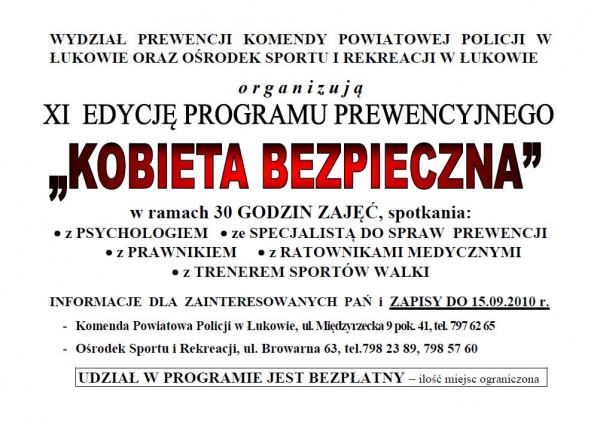 W Łukowie planowana jest już XI edycja kursu dla kobiet pod nazwą "Kobieta Bezpieczna". Organizatorem programu jest Wydział Prewencji Komendy Powiatowej Policji w Łukowie i Ośrodek Sportu i Rekreacji w Łukowie. Przedsięwzięcie jest adresowane do wszystkich kobiet bez względu na wiek, wykształcenie czy wykonywany zawód, bowiem każda z Pań może stać się potencjalną ofiarą.