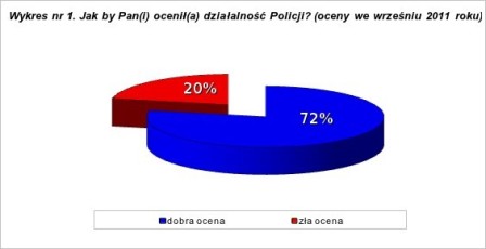 W dniach 8-14 września 2011 roku Centrum Badania Opinii Społecznej zrealizowało kolejną edycję badania instytucji publicznych, na reprezentatywnej próbie 1077 dorosłych Polaków. Oceny Policji są stabilne i wysokie. Pozytywnie na temat działalności wypowiada się większość ankietowanych (72%), natomiast przeciwnego zdania jest jedna piąta respondentów (20%) - wykres nr 1.