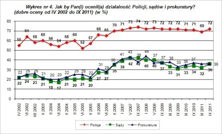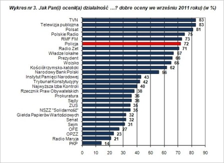 Po raz kolejny większość Polaków (72 proc.) dobrze ocenia działalność Policji. Z badania dotyczącego oceny instytucji publicznych, zrealizowanego przez Centrum Badania Opinii Społecznej na początku września 2011 roku, wynika, że lepiej od Policji oceniane są tylko niektóre media.