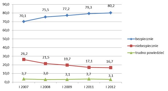 Warto podkreślić, że oceny te mają potwierdzenie w innym badaniu opinii realizowanym cyklicznie przez CBOS (ostatnia edycja z kwietnia 2011 r.), gdzie wskazania poczucia bezpieczeństwa w miejscu zamieszkania również przekraczają 80 proc.