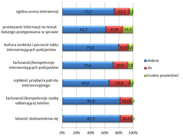 Warto też podkreślić, że ponad 10 proc. respondentów (1807 osób) zgłaszało w ciągu ostatniego roku prośbę o interwencję na telefon alarmowy 997, 112. Do tych właśnie osób skierowano szereg pytań o ocenę tej interwencji – od możliwości dodzwonienia się, przez fachowość policjantów przyjmujących zgłoszenie oraz załatwiających interwencję, po przekazanie informacji na temat dalszego postępowania w sprawie. Zarówno ocena ogólna interwencji, jak też jej poszczególnych elementów jest wysoka – ogólnie całą interwencję dobrze ocenia 73,7 proc. badanych.