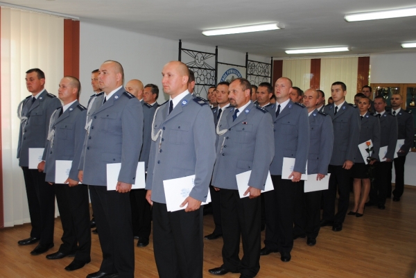 Podczas uroczystości I Zastępca Lubelskiego Komendanta Wojewódzkiego Policji insp. Mirosław Sokal oraz Komendant Powiatowy Policji w Łukowie podinsp. Andrzej Panasz wręczyli policjantom akty mianowania na wyższe stopnie policyjne. Ponadto 2 policjantów z naszej jednostki podczas wojewódzkich obchodów Święta Policji z rąk Komendanta Głównego Policji otrzyma odznakę „Zasłużony Policjant”. Trzech policjantów zostało wyróżnionych przez Lubelskiego Komendanta Wojewódzkiego Policji nagrodą pieniężną za wzorową postawę i bardzo dobre wyniki w służbie. Ogółem w tym roku mianowanie na wyższy stopień służbowy otrzymało 55 policjantów – 2 oficerów Policji, 20 aspirantów, 32 podoficerów i 1 starszy posterunkowy.