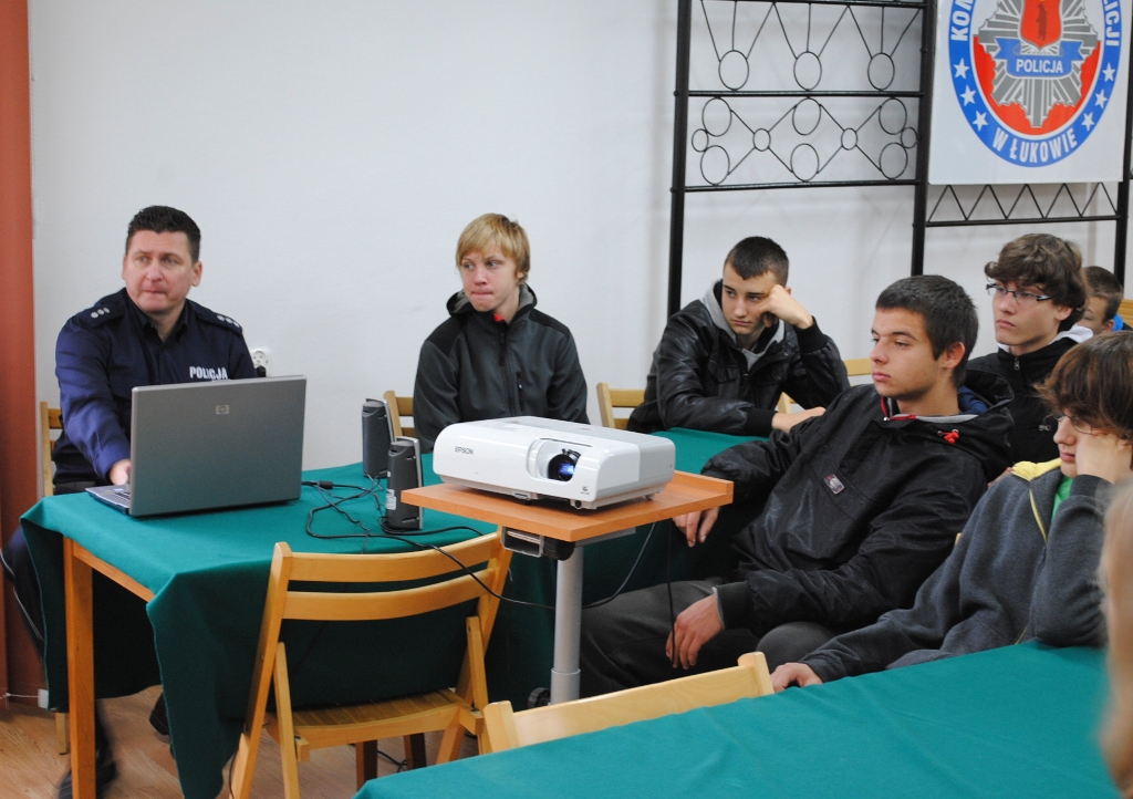Komendę Powiatową Policji w Łukowie odwiedziła młodzież z Gimnazjum Nr 2 w Łukowie. Uczniowie w trakcie kilkugodzinnego spotkania mieli możliwość zapoznania się w praktyce ze specyfiką pracy policjantów. Młodzież zdobyła też informacje o wymaganym wykształceniu, umiejętnościach i predyspozycjach, które są niezbędne do pełnienia służby w Policji. Dużym zainteresowaniem cieszył się pokaz sprzętu (w tym uzbrojenia) znajdującego się na wyposażeniu łukowskich policjantów oraz pomieszczenie dla osób zatrzymanych. Młodzież miała również okazję przyjrzenia się z bliska pracy techników kryminalistki. Z dużym zainteresowaniem młodzi goście słuchali też pogadanki na temat bezpiecznych zachowań w szkole, w domu oraz podczas odpoczynku.