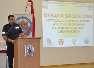 Debatę rozpoczął Komendant Powiatowy Policji w Łukowie mł. insp. Andrzej Panasz, który po przywitaniu przybyłych uczestników, przedstawił prezentację multimedialną na temat bezpieczeństwa w ruchu drogowym na terenie powiatu łukowskiego. W prezentacji nie zabrakło również informacji o działaniach profilaktycznych, które były prowadzone na terenie powiatu łukowskiego. Poruszono również bardzo ważną kwestię dotyczącą używania kamizelek odblaskowych przez pieszych i rowerzystów.