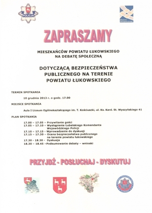 W tym celu serdecznie zapraszamy mieszkańców powiatu łukowskiego na kolejną debatę społeczną tym razem poświęconą bezpieczeństwu publicznemu na terenie powiatu łukowskiego, która odbędzie się 10 grudnia 2013 roku o godz. 17.00 w Auli I Liceum Ogólnokształcącego im. T. Kościuszki w Łukowie, ul. Ks. Kard. St. Wyszyńskiego 41.