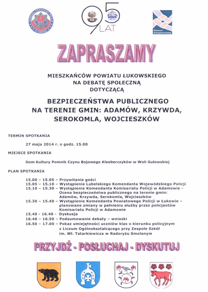 W tym celu serdecznie zapraszamy mieszkańców powiatu łukowskiego, na debatę społeczną poświęconą bezpieczeństwu publicznemu na terenie gmin: Adamów, Krzywda, Serokomla, Wojcieszków, która odbędzie się 27 maja 2014 roku o godzinie 15.00 w Domu Kultury „Pomnik Czynu Bojowego Kleeberczyków” w Woli Gułowskiej.