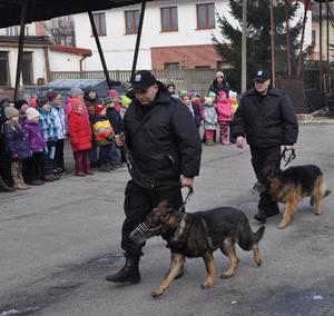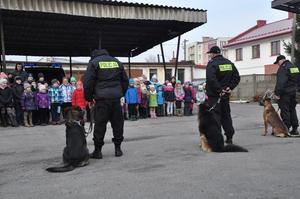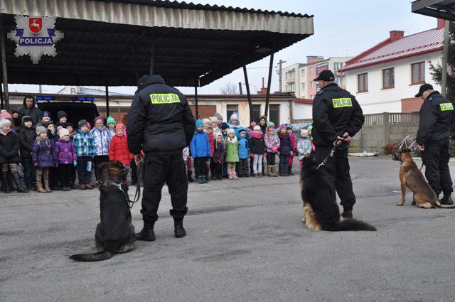 Dzisiaj komendę odwiedziły dzieci spędzające czas ferii zimowych na zajęciach w Łukowskim Ośrodku Kultury. Jak zawsze dużym zainteresowaniem naszych małych gości cieszyły się radiowozy i motocykle oraz ich wyposażenie. Maluchy mogły dokładnie obejrzeć wnętrze radiowozu i dowiedzieć się, jak działa zainstalowany w nim sprzęt. Jednak największe zainteresowanie maluchów skupiły na sobie psy służbowe. Przygotowany przez przewodników i ich podopiecznych pokaz tresury, dzieci nagrodziły gromkimi brawami. Przy okazji pokazu policjanci opowiedzieli dzieciom, jak należy zachowywać się i bronić podczas spotkania z bezpańskim oraz agresywnym psem.