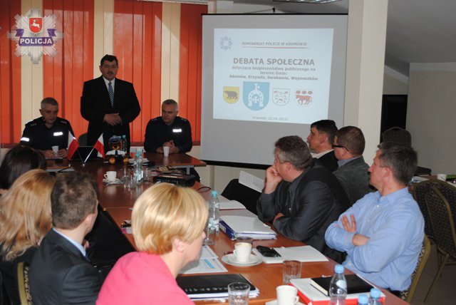 Na wstępie Komendant Komisariatu Policji w Adamowie kom. Leszek Misiak przywitał wszystkich gości i przedstawił program spotkania oraz cel i istotę debat społecznych. Komendant wyraził podziękowanie wszystkim zebranym, że tak licznie odpowiedzieli na zaproszenie do wzięcia udziału we wspólnym spotkaniu i dyskusji. Po tym wystąpieniu przedstawiono prezentację na temat aktualnego stanu bezpieczeństwa na terenie gminy Krzywda.