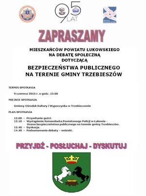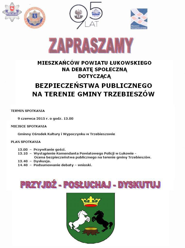 W tym celu serdecznie zapraszamy mieszkańców powiatu łukowskiego, na debatę społeczną poświęconą bezpieczeństwu publicznemu na terenie gminy Trzebieszów., która odbędzie się 9 czerwca 2015 roku o godzinie 13.00 w Gminym Ośrodku Kultury i Wypoczynku w Trzebieszowie.