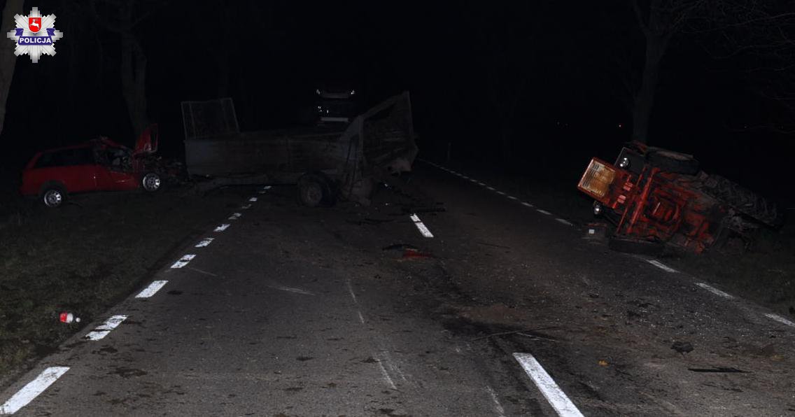 O ogromnym szczęściu mogą mówić uczestnicy zdarzenia drogowego do którego doszło wczoraj po godzinie 17:00 na drodze wojewódzkiej nr 806. Pierwsze ustalenia policjantów wskazują na to, że kierujący samochodem marki Audi, 39-latek z Międzyrzeca Podlaskiego, uderzył w dołączony do ciągnika rolniczego rozrzutnik. Siła uderzenia była tak duża, że ciągnik rolniczy wywrócił się na jezdni, droga w tym miejscu była zablokowana przez kilka godzin. W wyniku wypadku obaj kierujący doznali obrażeń ciała i zostali przewiezieni do szpitala. Na szczęście były to niegroźne urazy, życiu i zdrowiu mężczyzn nie zagraża niebezpieczeństwo. Pracujący na miejscu policjanci z łukowskiej drogówki wstępnie ustalili, że dołączony do ciągnika rolniczego rozrzutnik nie był dostatecznie oświetlony. Teraz prowadzący postępowanie ustalą szczegóły, okoliczności i przebieg zdarzenia. Funkcjonariusze sprawdzą między innymi z jaką prędkością poruszał się samochód marki Audi, sprawdzą jak były oświetlone pojazdy biorące udział w wypadku.