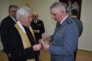 Ksiądz Prałat Antoni Pietruszka, duszpasterz łukowskich policjantów, poświęcił wigilijny opłatek i w ciepłych słowach podziękował funkcjonariuszom za ciężką i pełną poświęceń pracę.