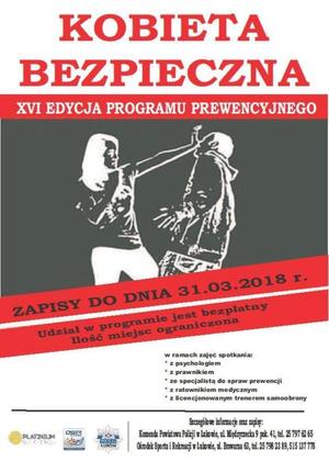 Wszystkie Panie zainteresowane udziałem w programie prewencyjnym „Kobieta Bezpieczna” , mogą do 31 marca 2018 roku zapisać się w Komendzie Powiatowej Policji w Łukowie przy ul. Międzyrzeckiej 9, pokój 41, tel 25 797 6265 lub w Ośrodku Sportu i Rekreacji w Łukowie przy ul. Browarnej 63, tel. 25 798 2389, 515 137 778.
