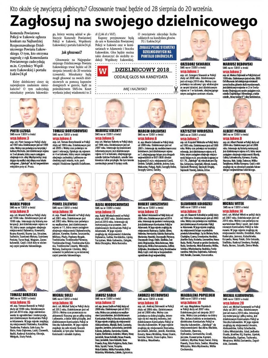 W ramach konkursu sylwetki dzielnicowych prezentowane będą od 28 sierpnia do 30 września 2018 roku na łamach Wspólnoty Łukowskiej, portalu internetowego Łuków24.pl oraz na stronie internetowej KPP w Łukowie.