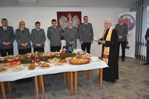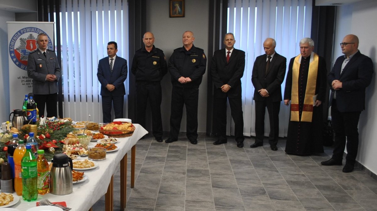 Ksiądz Prałat Antoni Pietruszka, duszpasterz łukowskich policjantów, poświęcił wigilijny opłatek i w ciepłych słowach podziękował funkcjonariuszom za ciężką i pełną poświęceń pracę.