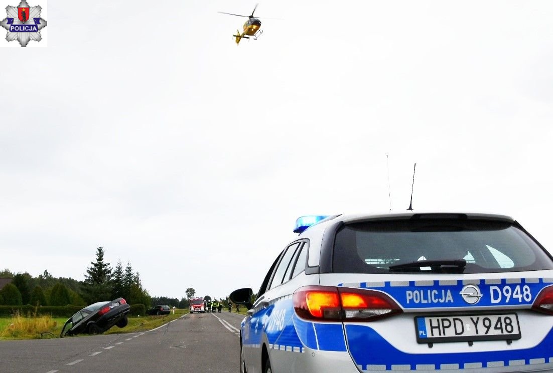 Z poważnymi obrażeniami ciała przetransportowano śmigłowcem z miejsca wypadku drogowego 35-latka z gminy Wojcieszków. Mężczyzna kierując samochodem marki Audi zderzył się ze skręcającym na skrzyżowaniu drugim audi.