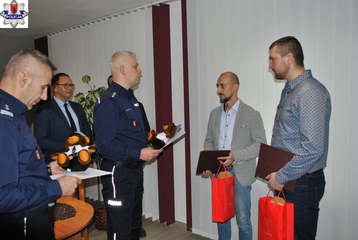 Bohaterska postawa dwóch mężczyzn spotkała się z ogromną aprobatą łukowskich policjantów. Dzisiaj Pan Tomasz i Pan Marcin zostali zaproszeni do gabinetu Komendanta Powiatowego Policji w Łukowie. Mężczyźni otrzymali gorące podziękowania i słowa uznania za godną naśladowania postawę. Nadkom. Leszek Misiak podziękował za wzorową, obywatelską postawę, którą Panowie wykazali się gdy zareagowali widząc mężczyznę bijącego i próbującego okraść pokrzywdzoną kobietę. Dziękując za natychmiastową reakcję, zaangażowanie i pewność siebie nadkom. Misiak zaznaczył, że tak postawa powinna być przykładem i wskazówką dla innych osób, świadków naruszenia prawa. Nadkom. Leszek Misiak mówił, że swoim działaniem Panowie pokazali, że należy przełamywać stereotypy wobec biernych zachowań, że można skutecznie przyczyniać się do ujęcia sprawców przestępstw i wykroczeń.