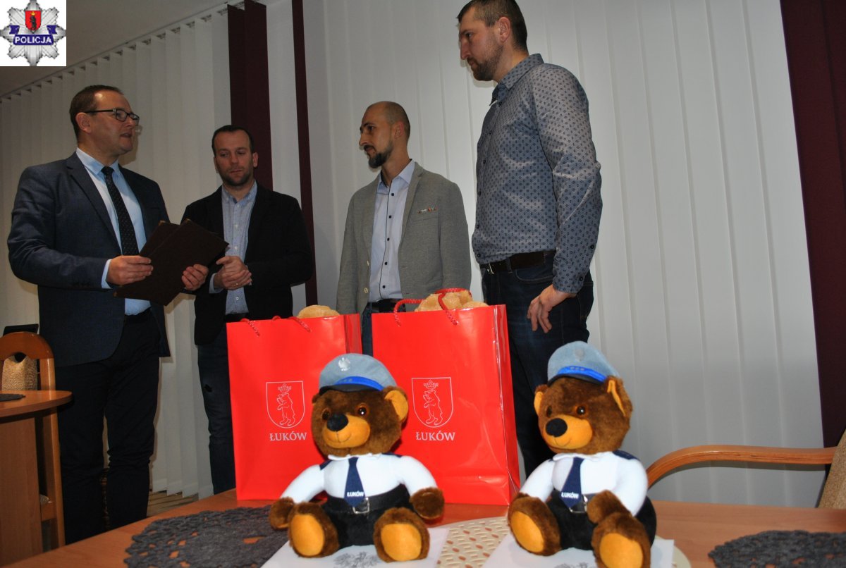 Do życzeń i gratulacji dla Pana Tomasza i Pana Marcina przyłączył się Burmistrz Miasta Łuków Piotr Płudowski, który mówił, że taka postawa z całą pewnością zasługuje na pochwałę i wyróżnienie. Burmistrz zaznaczył, że jest dumny, że w naszym mieście są ludzie, którzy nie boją się zareagować na krzywdę wyrządzaną innym.